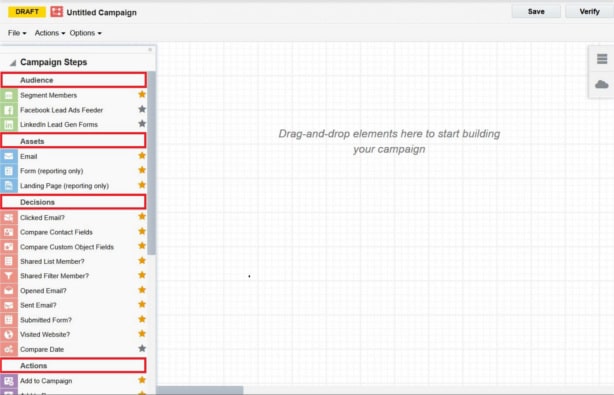 Campaign canvas in Eloqua is where we build workflows of elements of the campaign: segments, emails, landing pages, forms and decision elements, as well as actions. The campaign canvas includes a wide variety of elements that you can use to create rich, multi-step campaigns to best reach your marketing goals. The elements fall into four categories:
