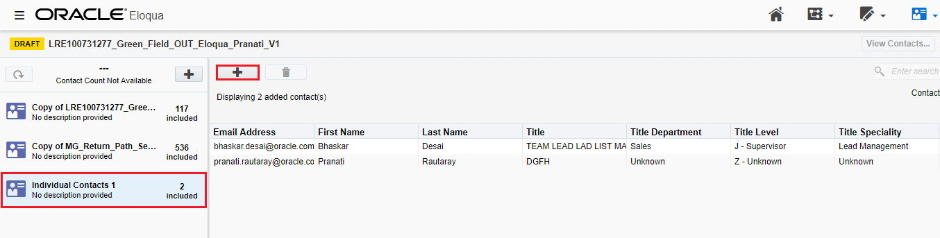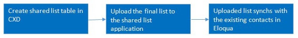 The shared list application is a simple internal tool to help upload the final email list in Eloqua for email launch. The shared list application is mainly useful for dynamic data updates in Eloqua, where the final shared list generated from CXD, with the latest contact information, is synched with the existing contacts in Eloqua. Contacts uploaded to Eloqua through the shared list application remain unaffected by the regular monthly purging process of Eloqua contacts.