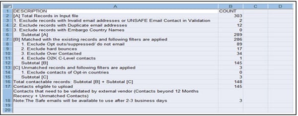 List Team verifies the contact list uploaded by the marketer and provides a report on the number of contacts that can be used for a campaign.