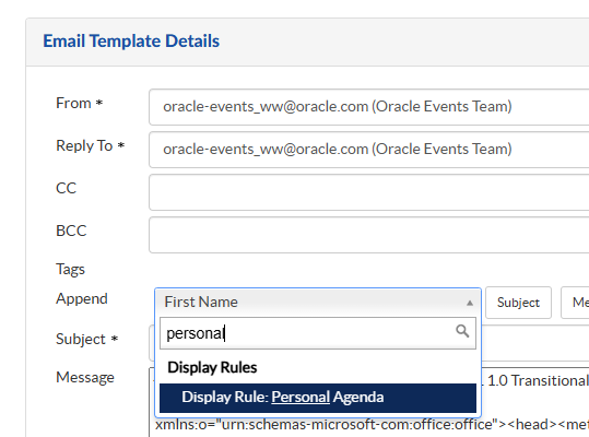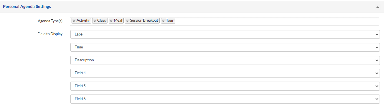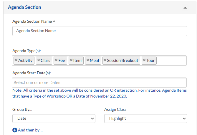 - Agenda Section is used to display Section Name, Type and to group Sessions/Tracks by Start Date, Track, Group and Location with grouping hierarchy in the web page. Retain only the Agenda type that you have created and rest can be removed. Label can be aligned Top/Left under Group Label Alignment and sessions can be formatted by changing Assign Class.
