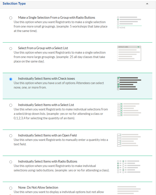 - Under Selection Type, there is an option to select the group based on Radio buttons, select list or Checkboxes as single-choice or multiple-choice selections.