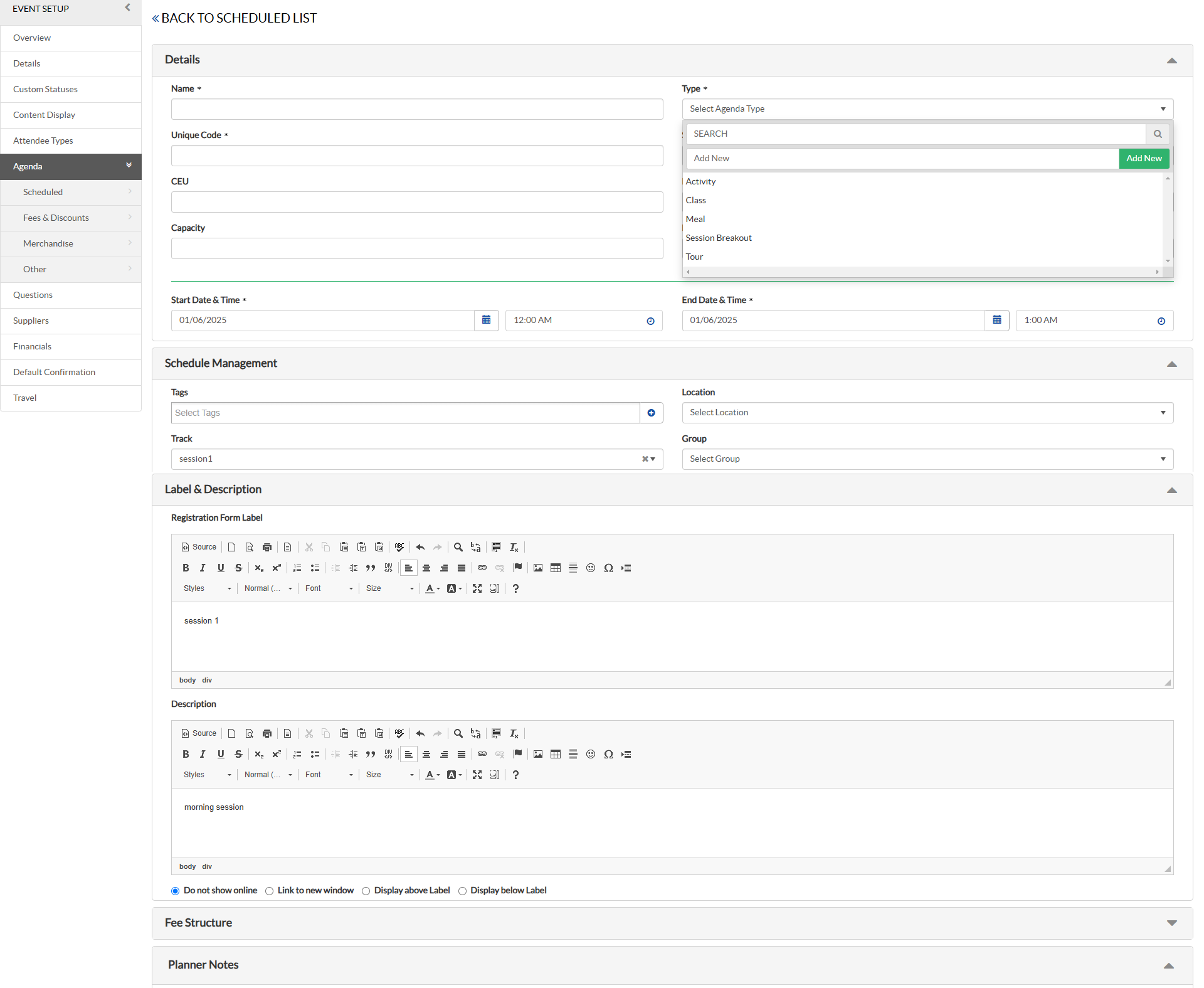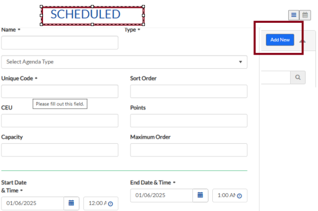 - On Left Navigation, choose Agenda and click on Add New to create the Agenda Section. To update the Agenda Section1 click on pencil icon and proceed.
