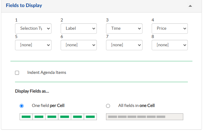 - The Fields To Display section is used to determine the optional fields to display in the online form about the session and track details and a option NONE can be selected if nothing has to be displayed.