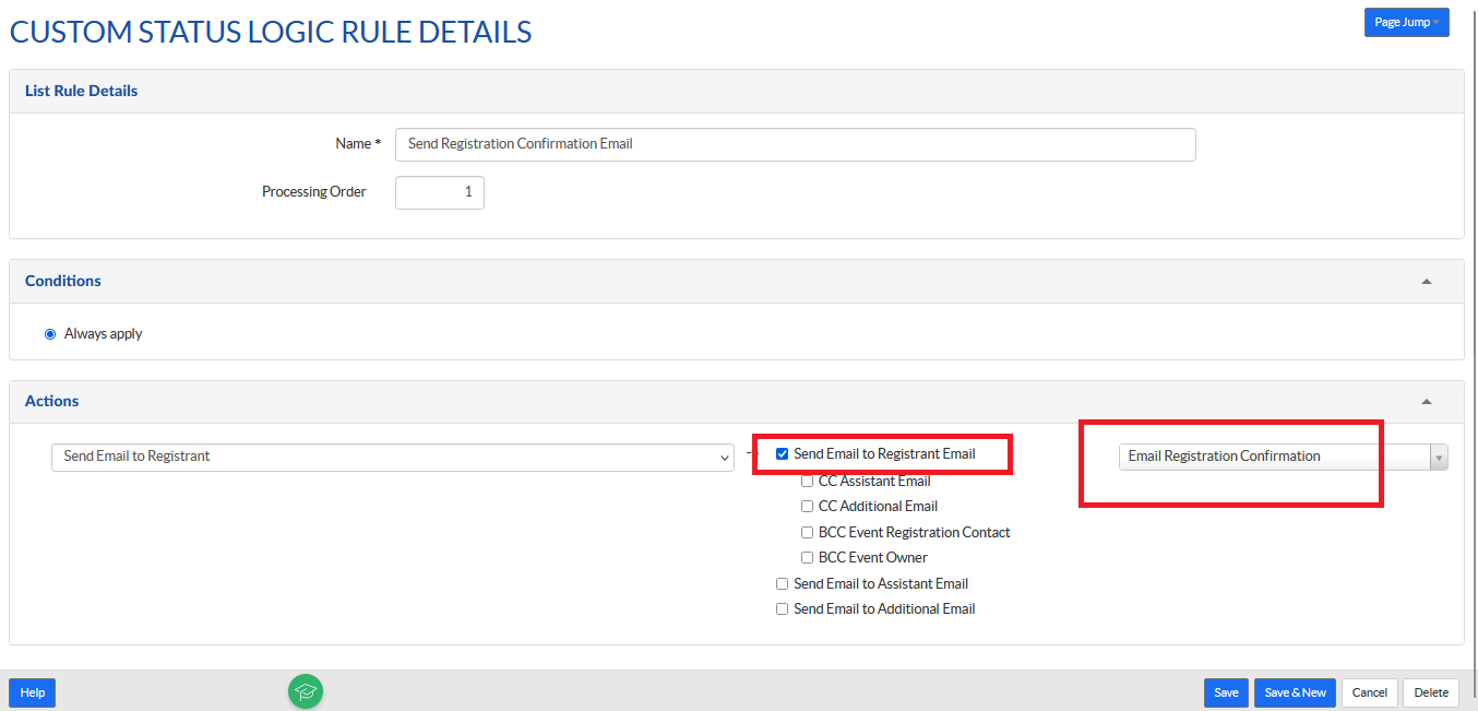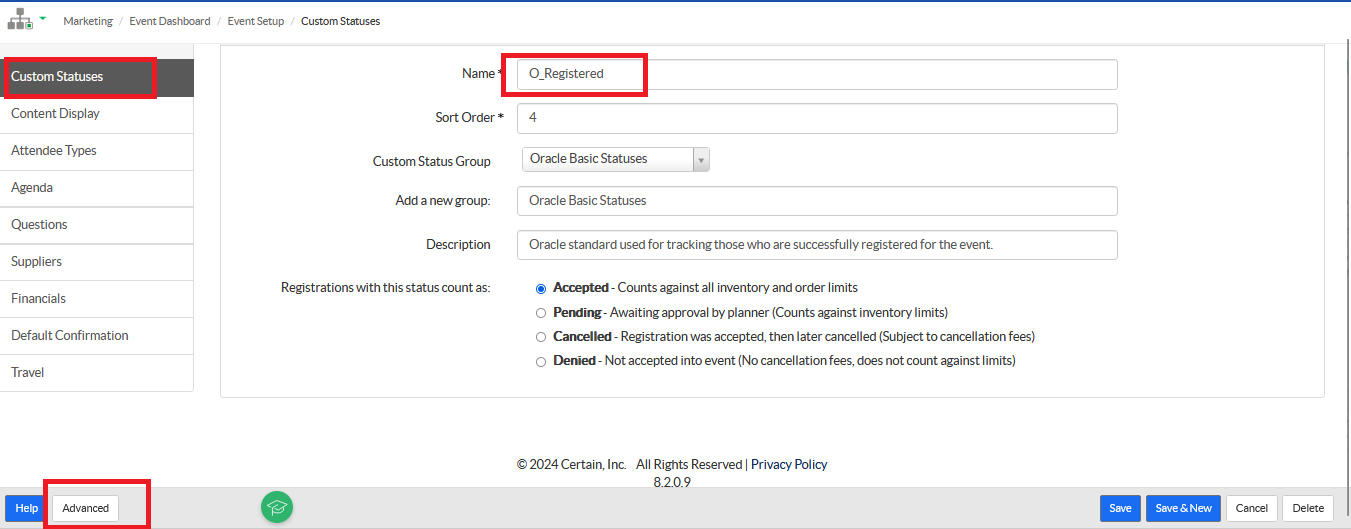 You must also associate the notification pages with the following custom statuses for standard registration. Refer to the steps and screenshot below to set the custom statuses.