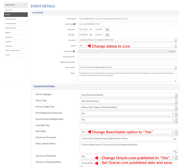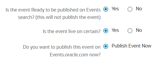 In this section, you will find steps for publishing events on events.oracle.com, also known as the events search page.