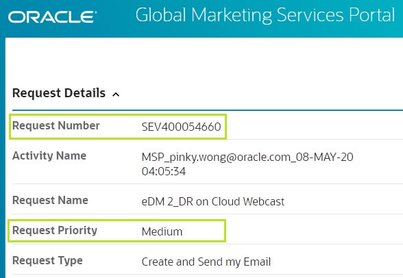 A request is raised by the marketer(requester) through the Global Marketing Services(GMS) Portal which is uniquely identified by the request number that starts with SEV (Create and Send my Email).
