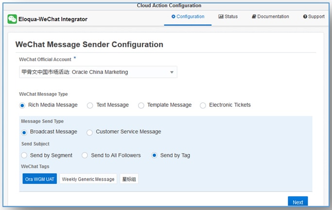 The integrator app links WeChat users with Eloqua contacts and forwards marketing information generated by Eloqua to WeChat users. Meanwhile, it automates the data process by allowing contact data with Wechat attributes flow into Eloqua and CXD.