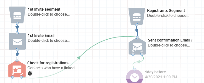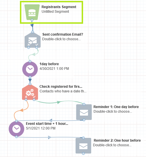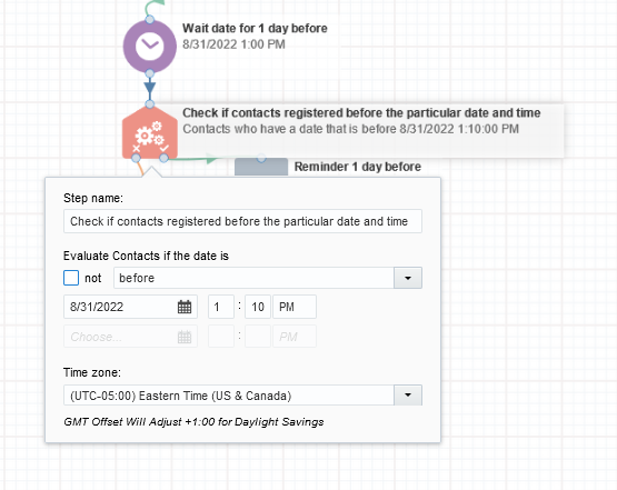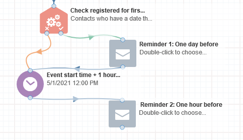 ● If the 'Compare Date Object' evaluation is satisfied.( i.e if the date of registration is 1 day and a minute before than the event date time), trigger the 1st Reminder and are moved to a Wait(set to one 1 hour before the 'event start date time') to recieve Reminder2.