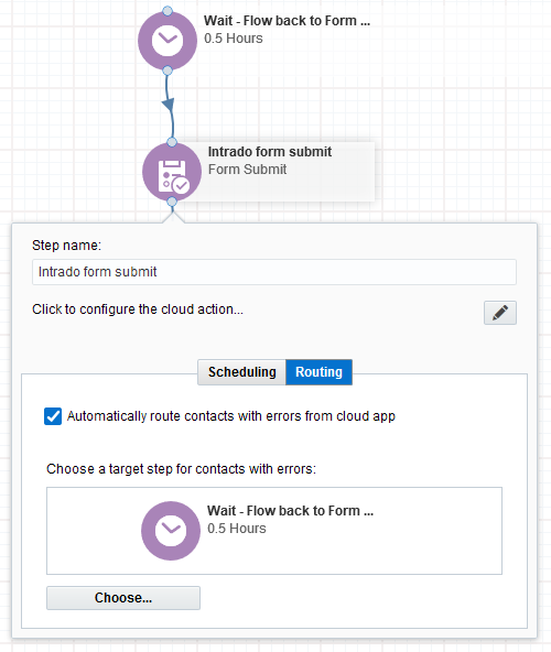 Configure Form Submit as shown below (route the contacts to wait step if errored out and then move back to the Cloud Form Submit.)