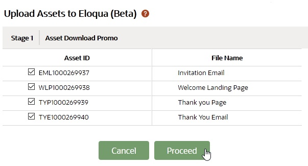 In Stage Properties, find the "Upload to Eloqua (Beta)" option. Click and select required assets to Upload and Proceed.