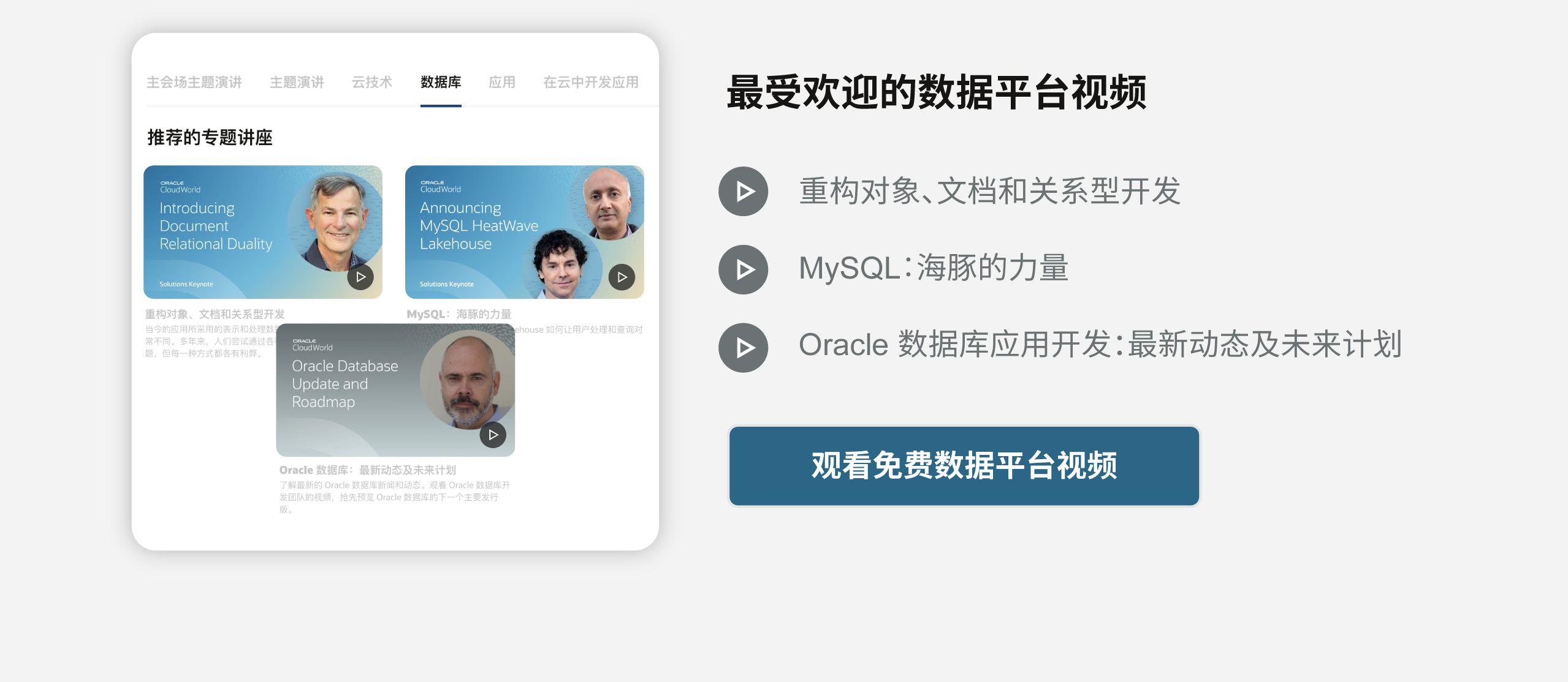 浏览 Oracle CloudWorld 2022 的视频资源,探索适合您的专题讲座。只需填写您的电子邮件,并选择您感兴趣的主题,即可开始免费观看视频回放。